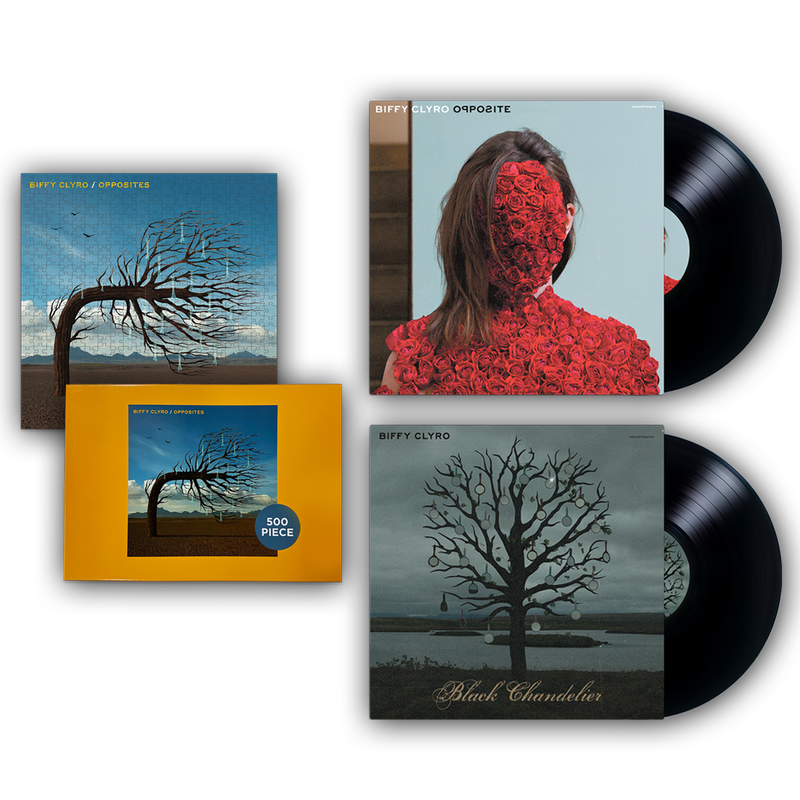 3 part bundle including 'Black Chandelier/Biblical' and 'Opposite/Victory Over The Sun' on vinyl and 500-piece square shaped jigsaw puzzle featuring the ‘Opposites’ album artwork.